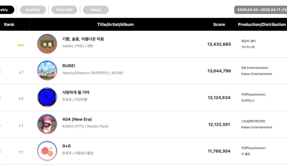 Circle Chart Reveals Top Rankings for the Week of April 5-11 Featuring Dominant Performances from AKMU and BTS