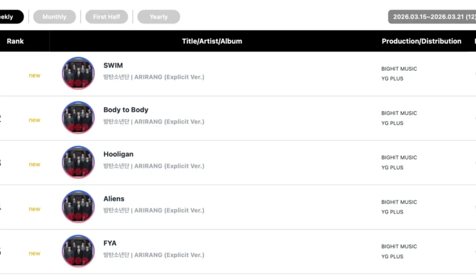 The Physical Album Chart saw BTS’s newest album, "ARIRANG," completely dominate the top three positions. The regular edition of the album made a powerful debut at number one, signaling immense anticipation and immediate commercial success. Following closely, the Weverse version secured the second spot, and the Limited Edition LP version claimed the third position, showcasing a comprehensive sell-out across different physical formats. This feat highlights the strategic release approach by the group’s agency, HYBE Corporation, catering to diverse fan preferences and maximizing sales potential.