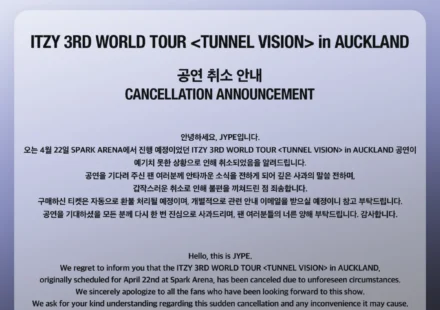 JYP Entertainment, the management agency for the acclaimed K-pop girl group ITZY, officially announced on April 2nd that the group’s highly anticipated "TUNNEL VISION" concert in Auckland, New Zealand, has been canceled. The event,…